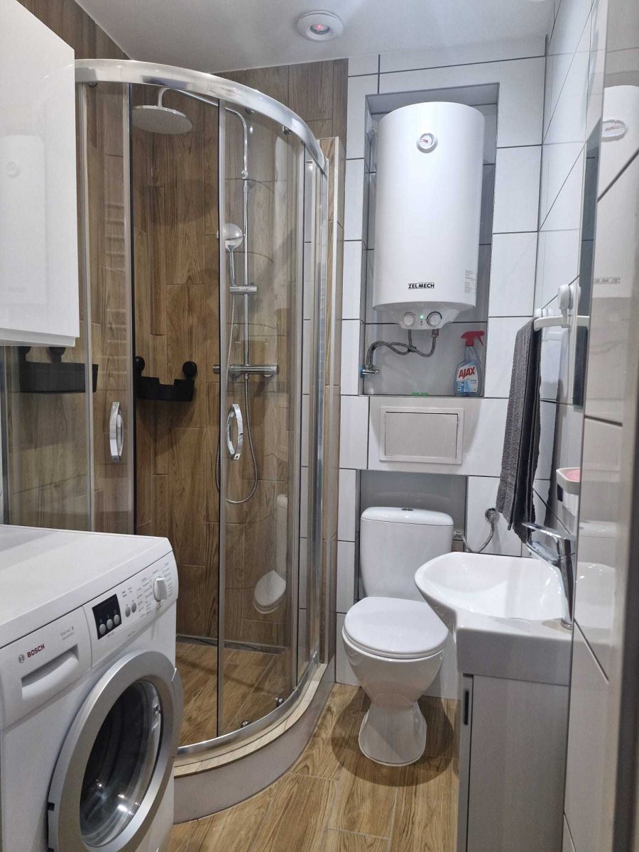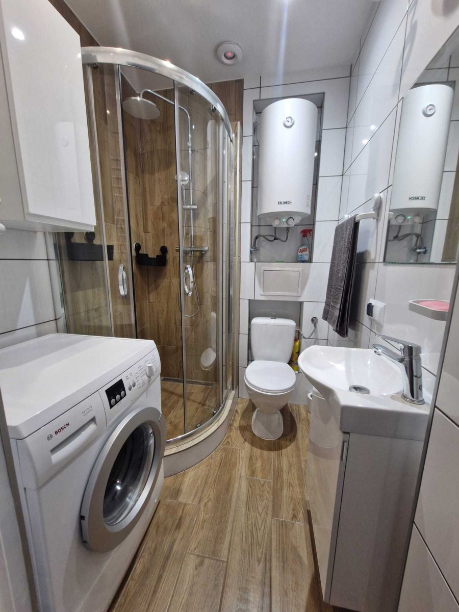 - Łazienka z kabiną prysznicową i pralką,
