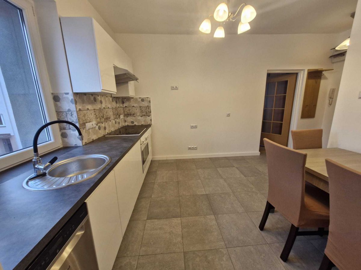 - Funkcjonalna kuchnia z częścią jadalną, wyposażona w lodówkę, okap, piekarnik, płytę elektryczną, zmywarkę 45 cm oraz stół z krzesłami,