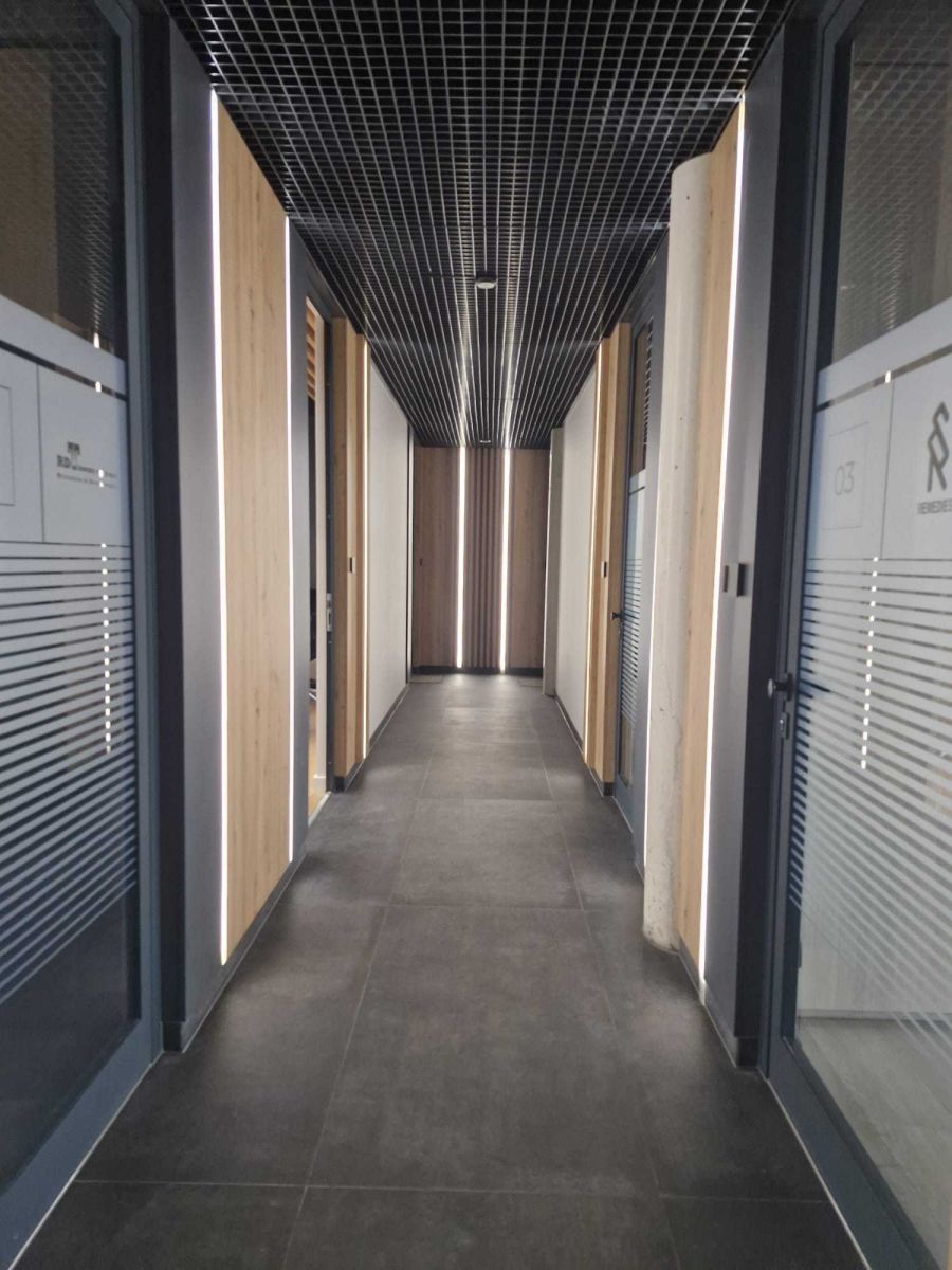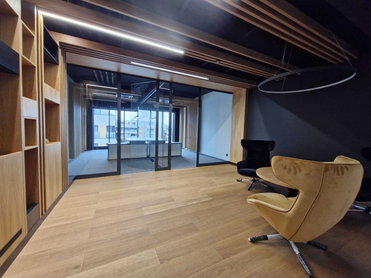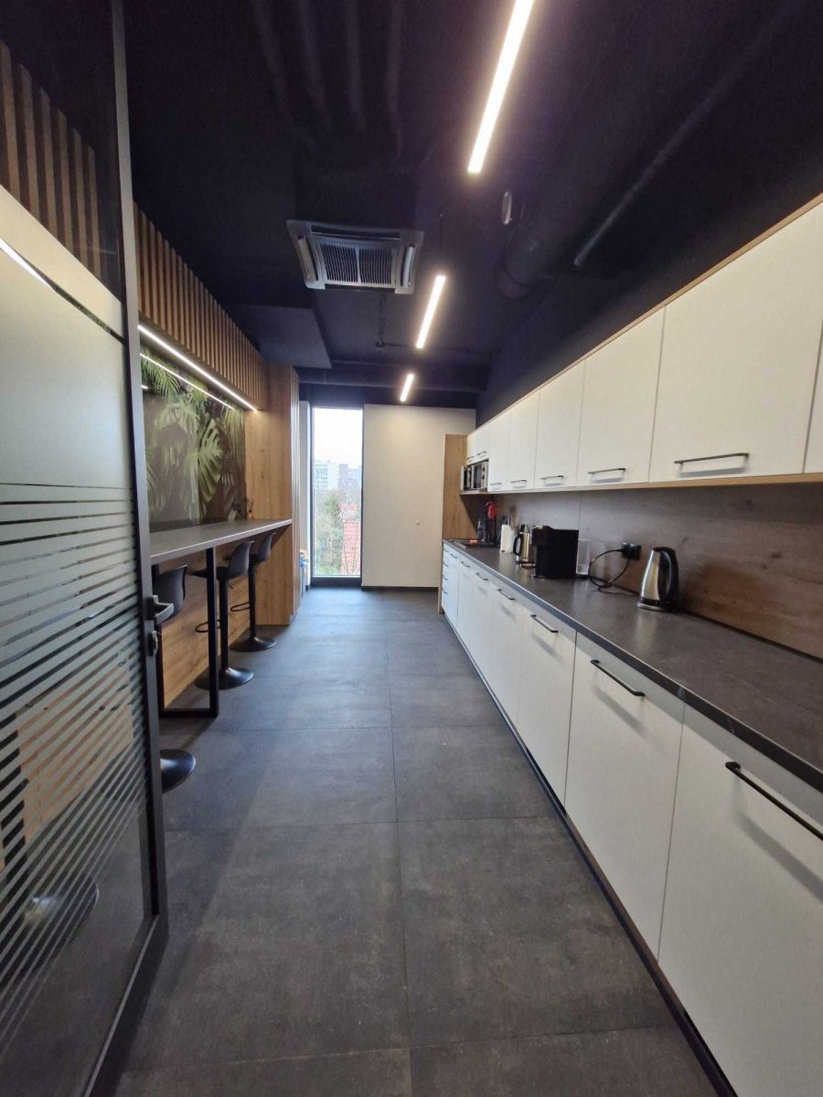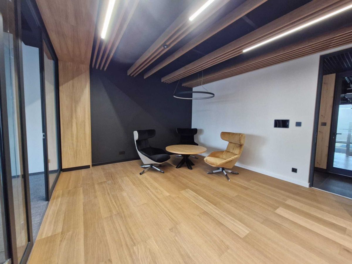 Lokal składa się z głównej, eleganckiej sali biurowej oraz dwóch mniejszych, funkcjonalnych pomieszczeń, oddzielonych szklanymi ścianami, co zapewnia doskonałe doświetlenie oraz nowoczesny, profesjonalny charakter wnętrza.