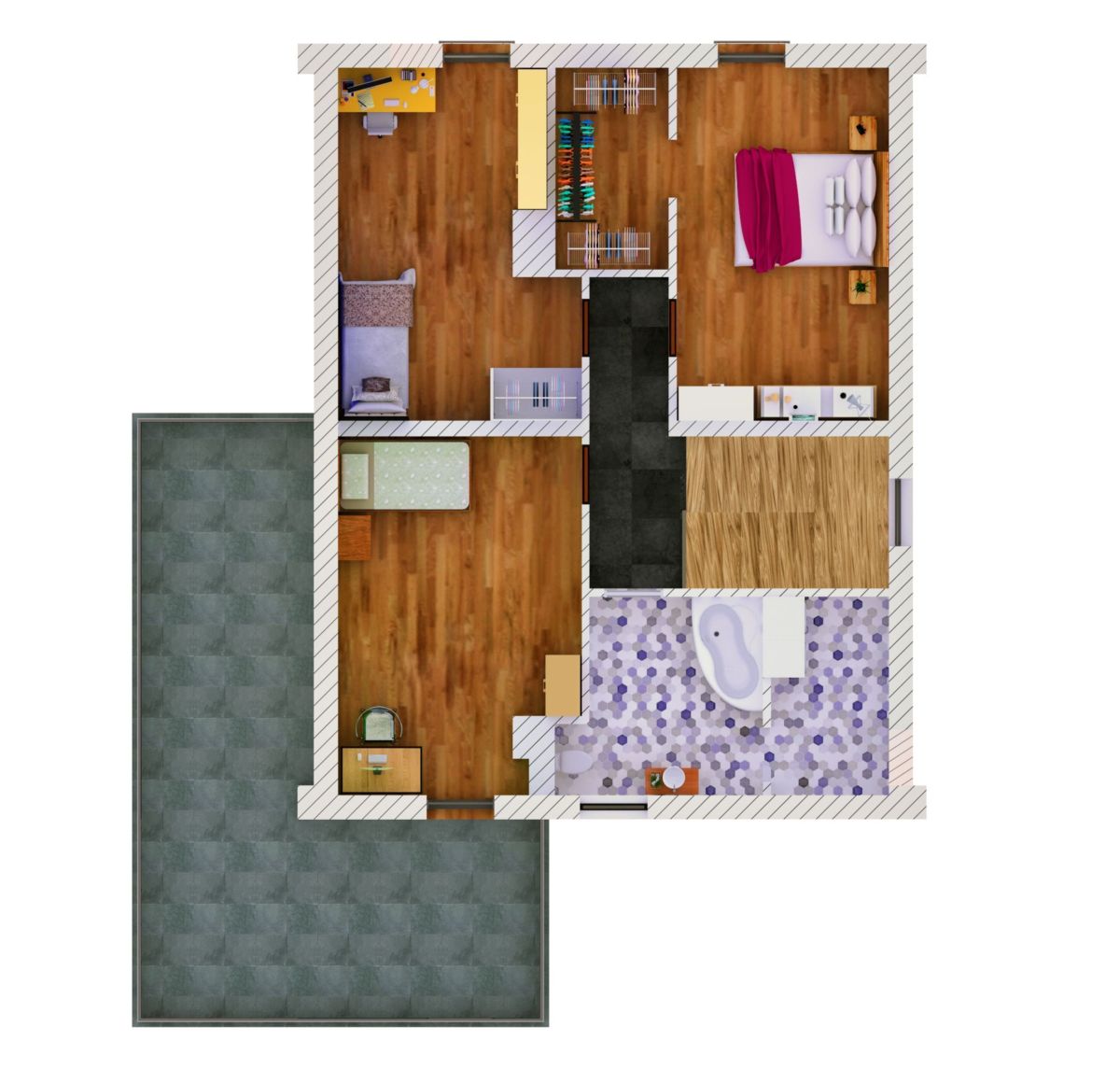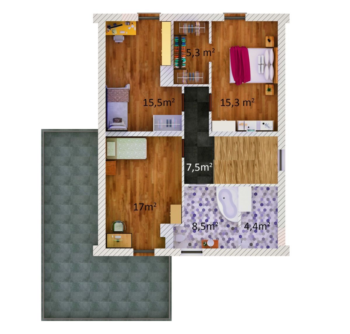 druga z wyjściem na taras (ok. 20 m²)