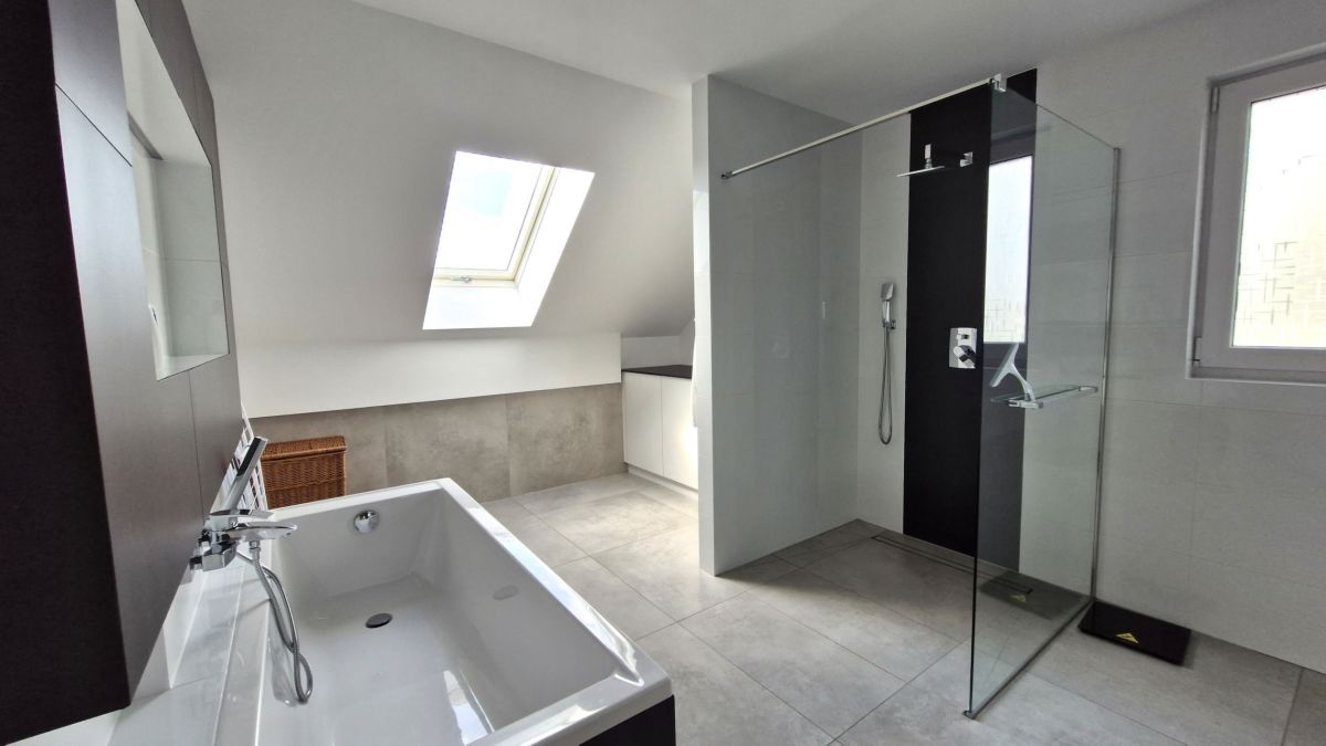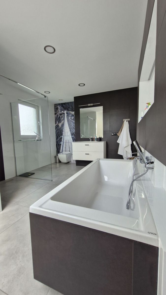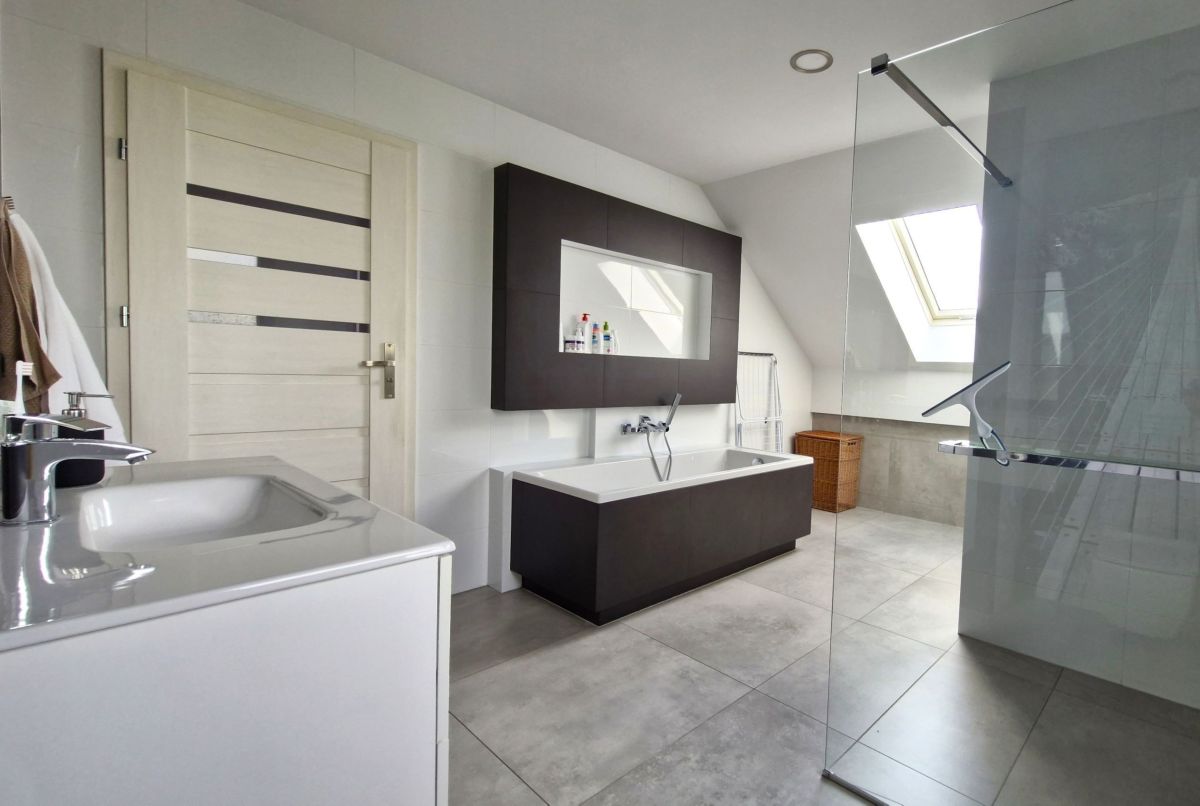 Duży pokój kąpielowy z wanną i prysznicem