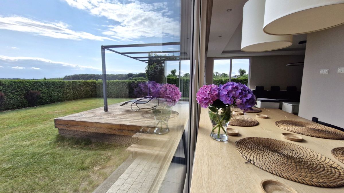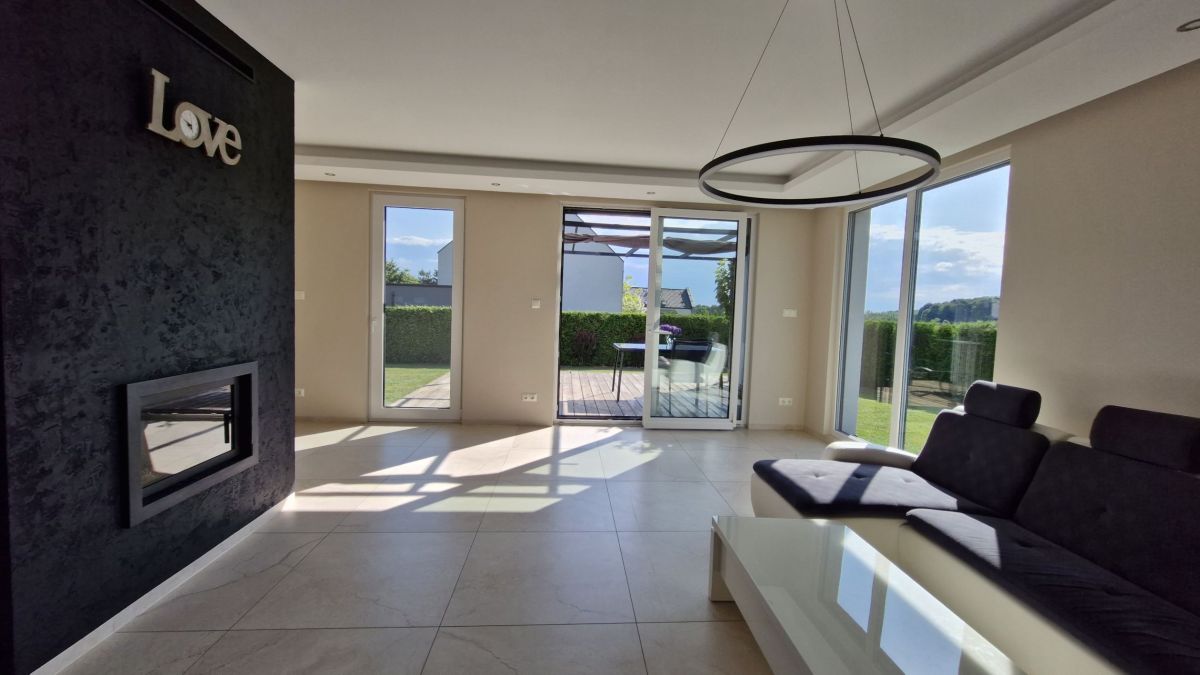 Przestronny salon z dużymi przeszkleniami i wyjściem na taras