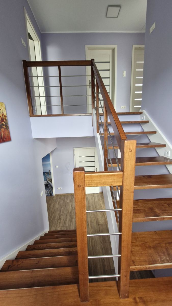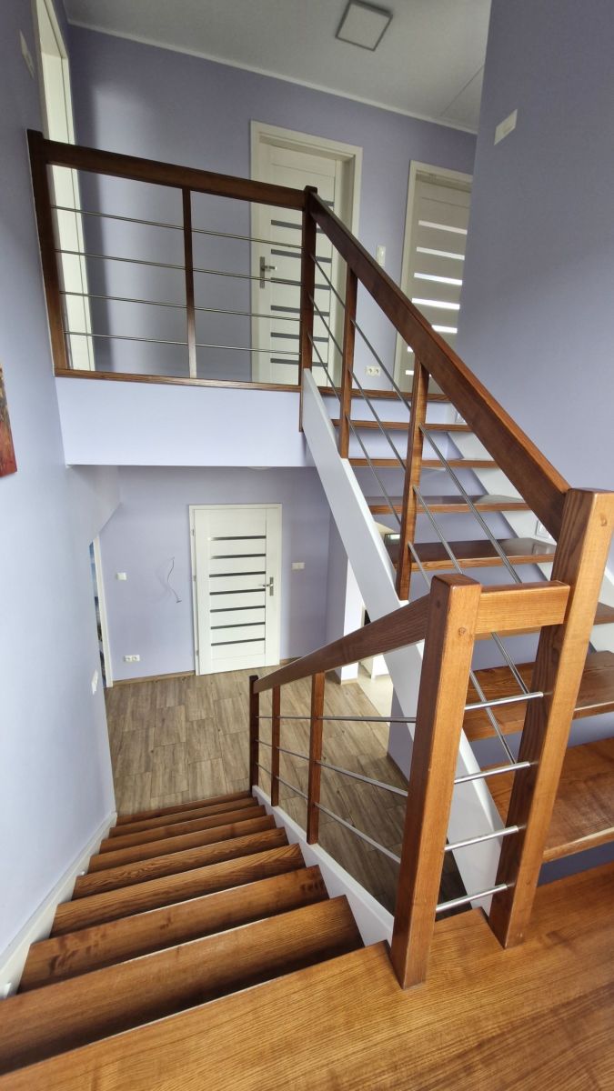 Podłogi: parter - glazura, piętro - panele, schody drewniane